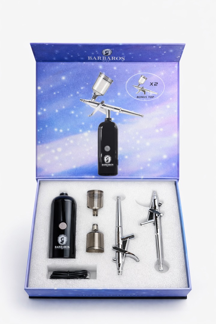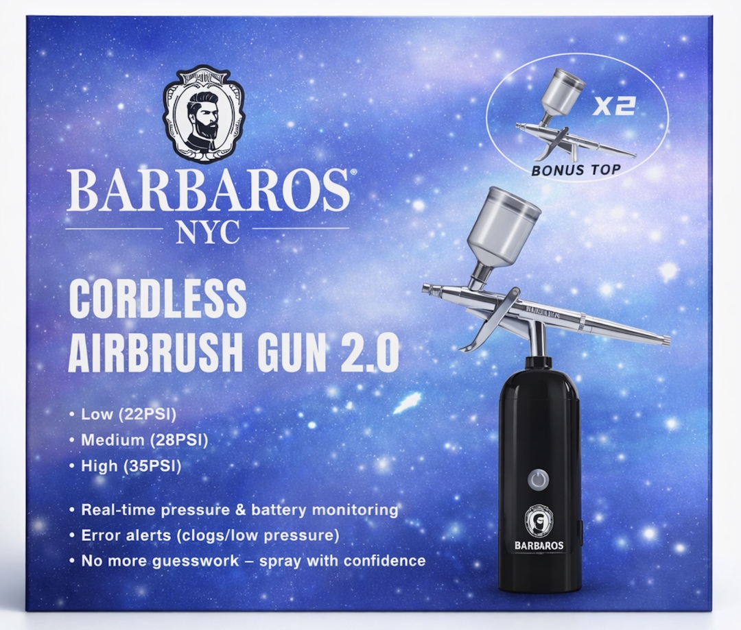 A professional-grade 35 psi cordless airbrush designed for precision detailing and enhancements. Lightweight and rechargeable, it delivers smooth, controlled spraying for barbers, stylists, and creatives looking to elevate line-ups, beard work, or artistic touches. Built for ease of use and long-lasting performance — bring sharp, clean results to every job.